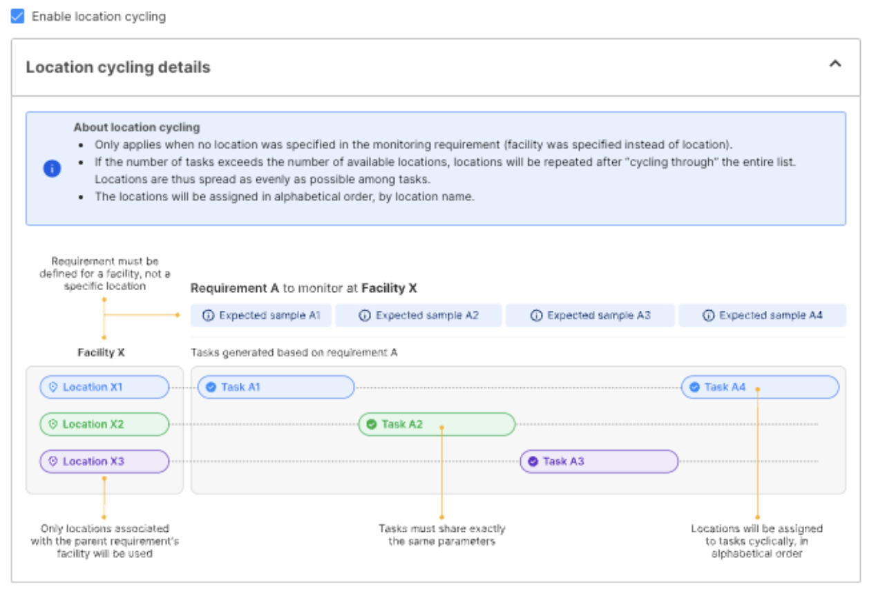 The introduction of the “Location” tab when using task auto generation enhances the distribution of sampling locations for requirements associated with facilities. When generating tasks for a facility-linked requirement, you can enable “location cycling,” a feature that assigns different locations to each task from the set associated with the facility. This distribution follows an alphabetical order, ensuring an even spread of tasks across locations. Once all locations have been assigned a task, the process repeats for the remaining tasks until all are accounted for within the facility. This feature streamlines the task assignment process, ensuring a systematic and efficient distribution of tasks across various locations.