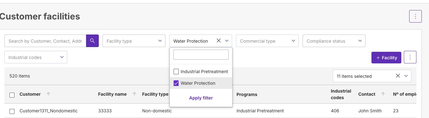 In the filter panel, select the program Water Protection and click Apply Filter to view all related facility.
