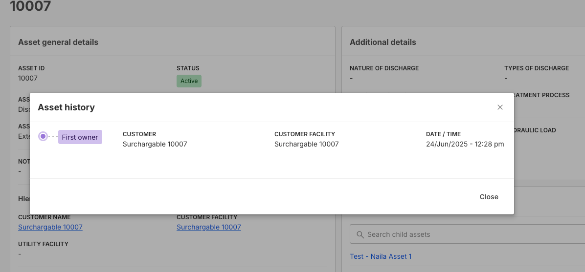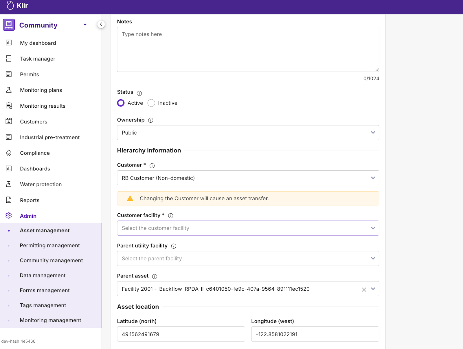 Assets can be transferred between customers and customer facilities directly from the Asset Edit page. This provides flexibility when managing assets, while maintaining a complete transfer history for traceability.
