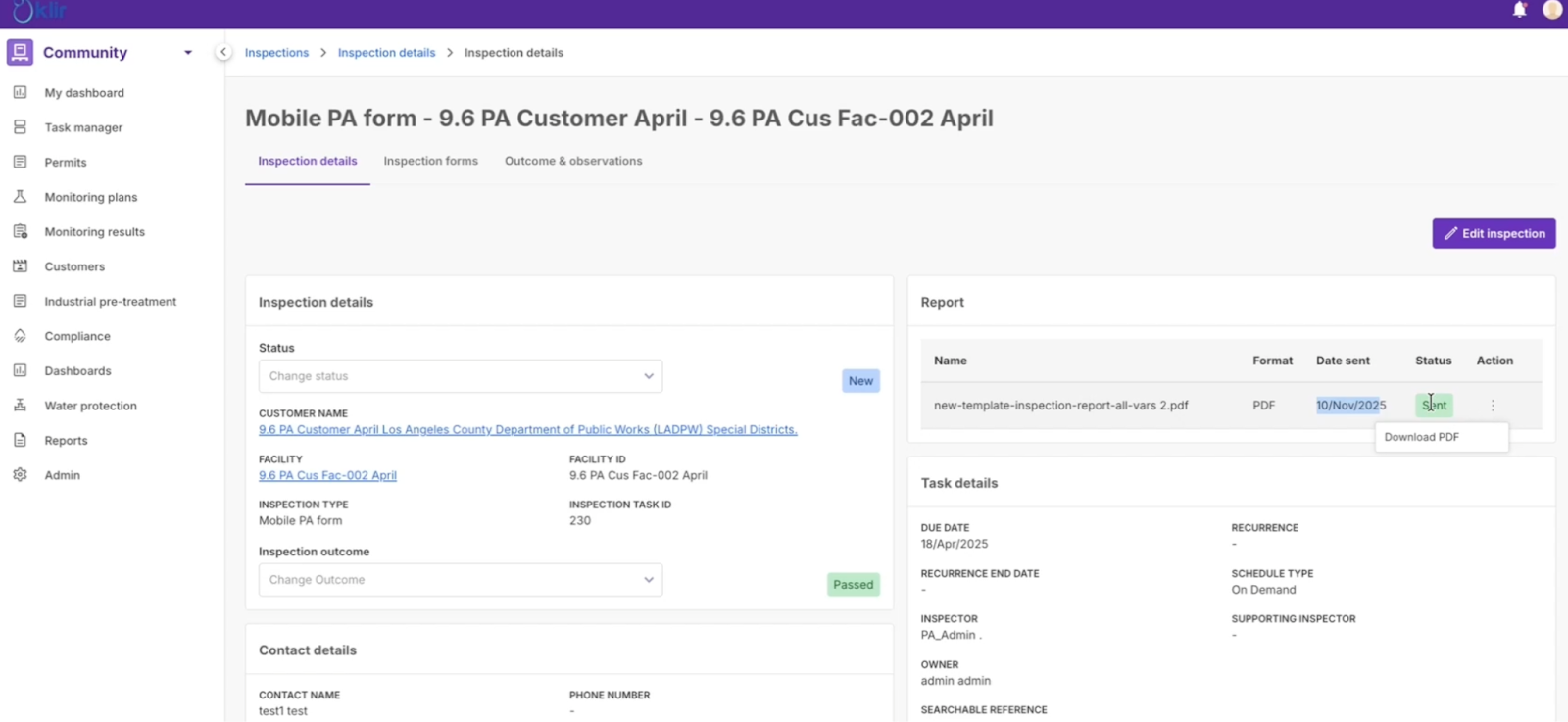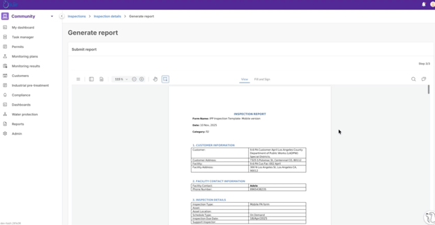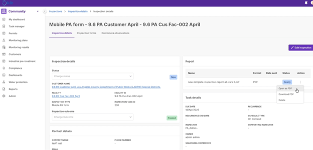 - Status Change: The report status changes from Draft to Ready. At this point, the report is permanent, and the system prevents further editing. At this stage, users can still delete the PDF, if they wish to start from scratch from the Inspection Details Report card actions.