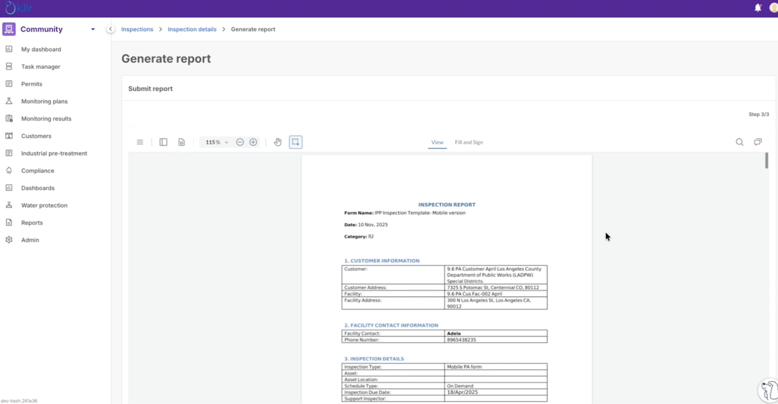 Inspection reports are generated from a completed inspection record and follow a three-step workflow.