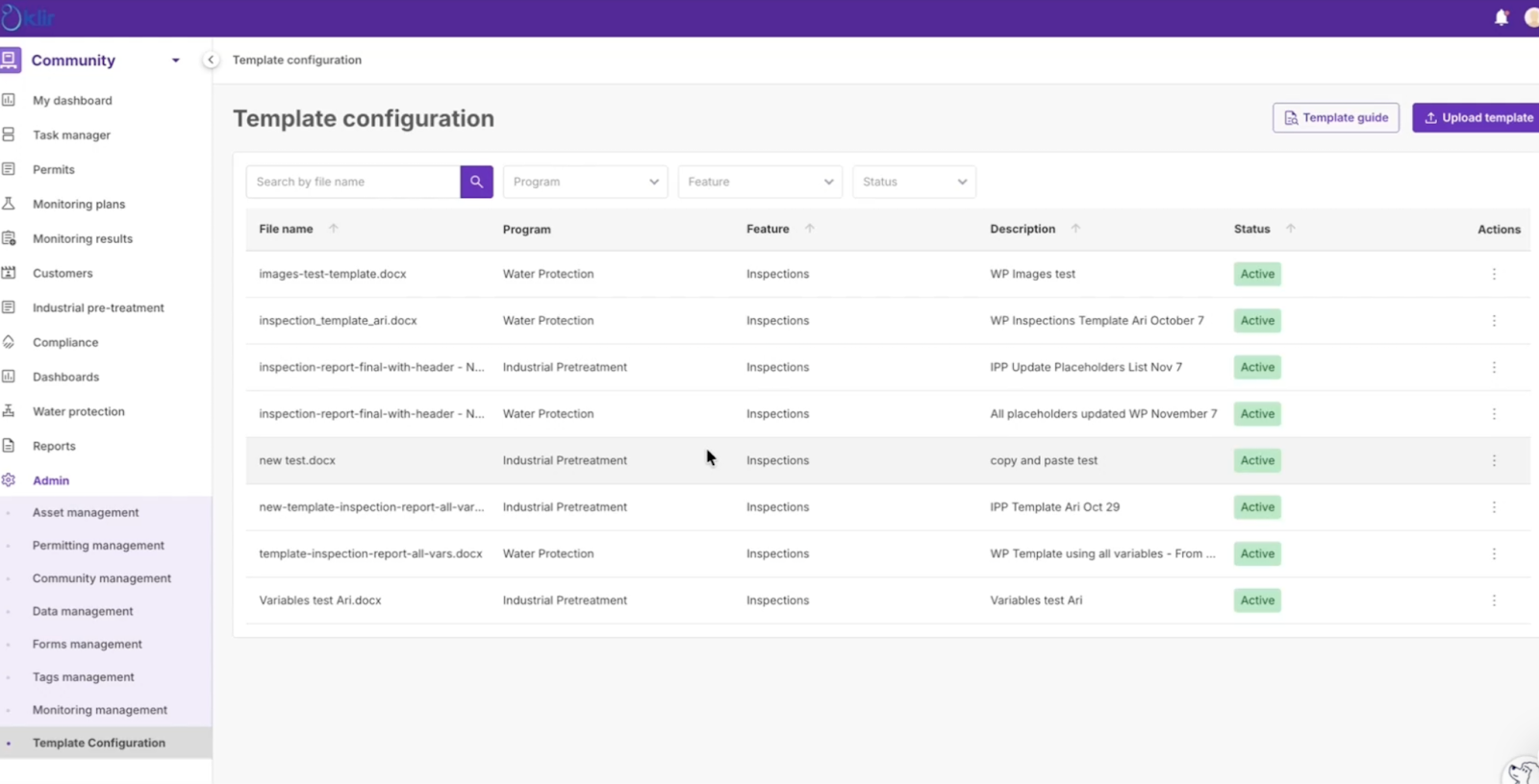 The Template Configuration screen is the central administrative hub for managing all inspection report templates.
