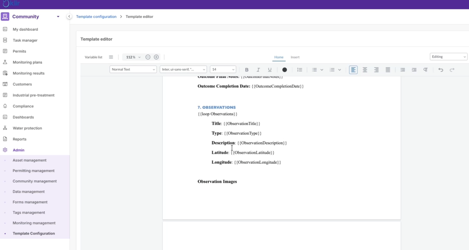 After uploading, templates can be reviewed and updated using the Template Editor, a rich-text interface that supports dynamic data placeholders.