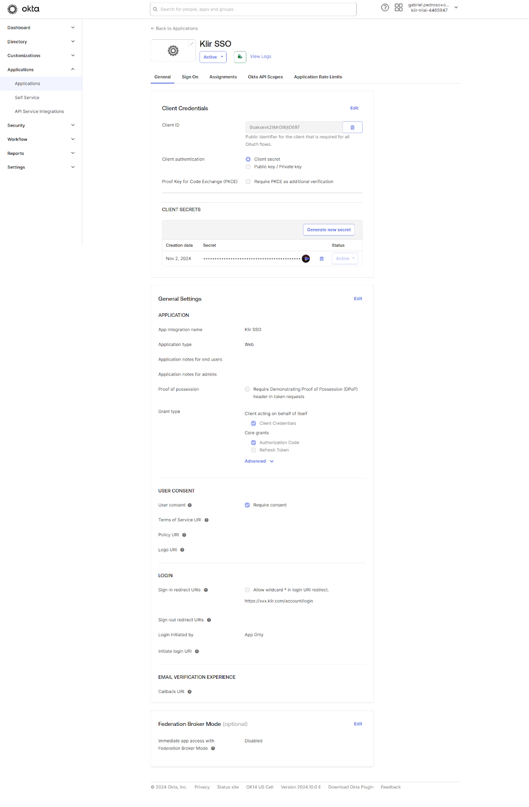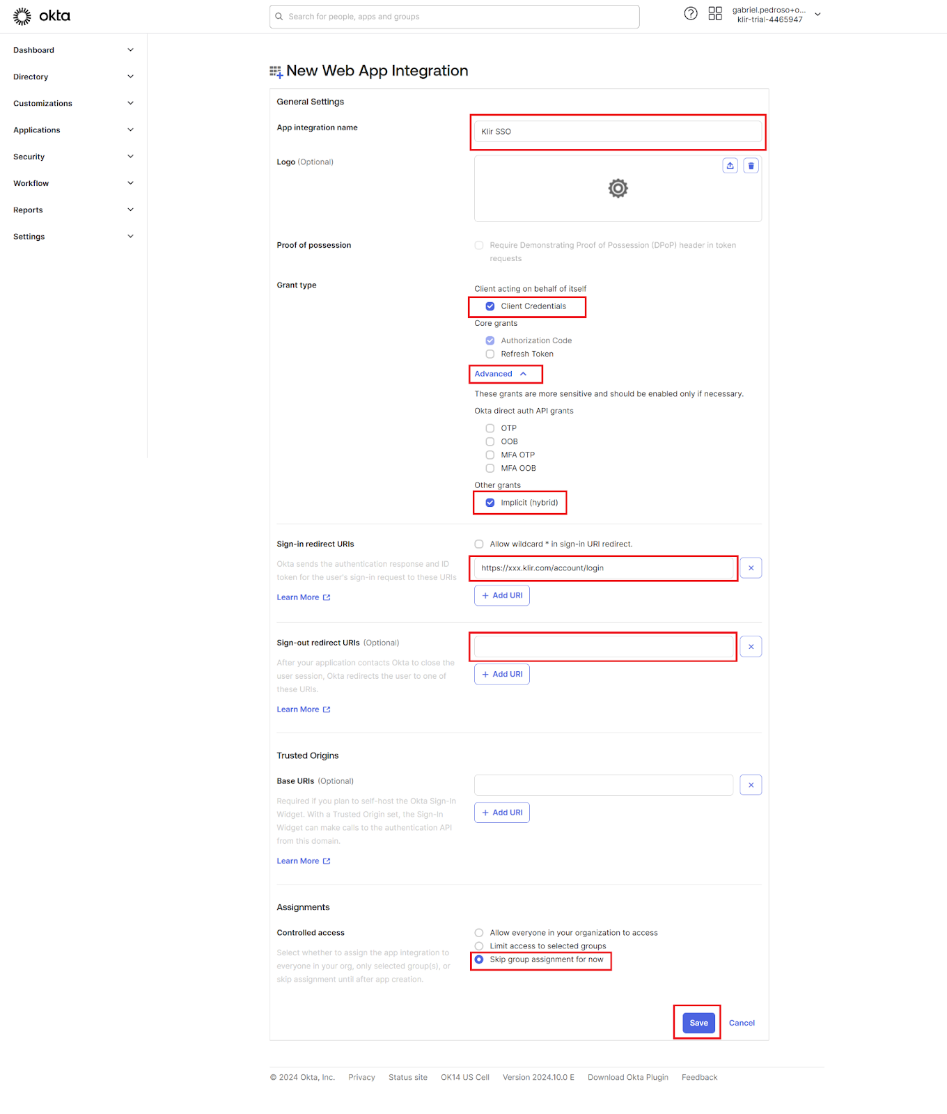 - Set the App integration name as your desired name (e.g., "Klir SSO").