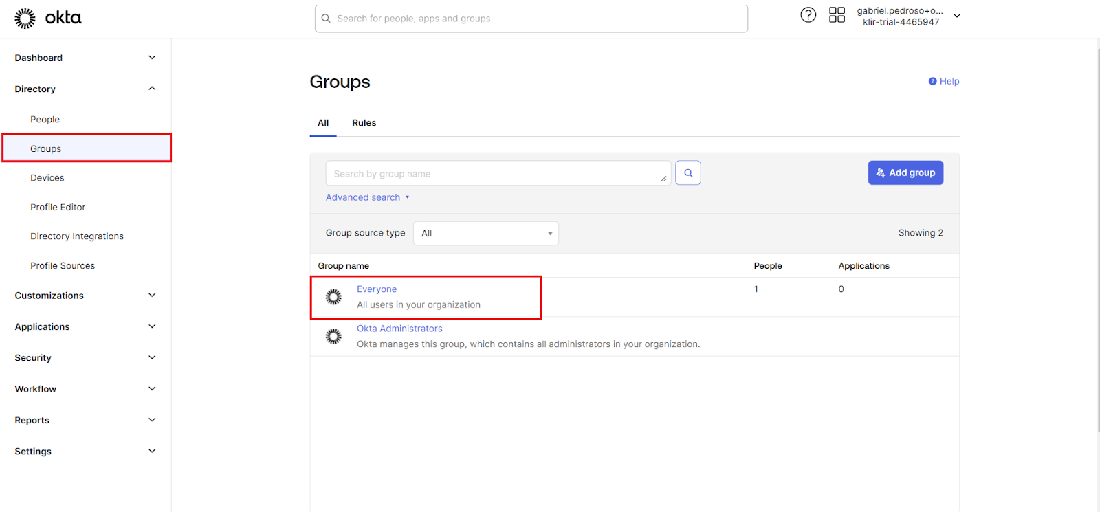 - Go to the Directory section on the sidebar, then select Groups.
