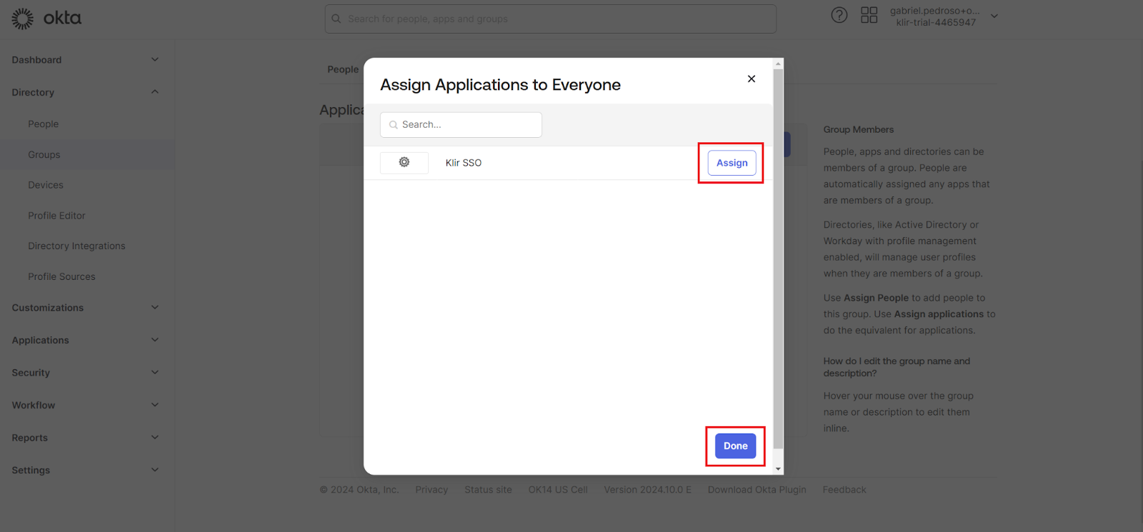 - Find the newly created app (e.g., "Klir SSO"), click Assign, and then confirm by clicking Done.