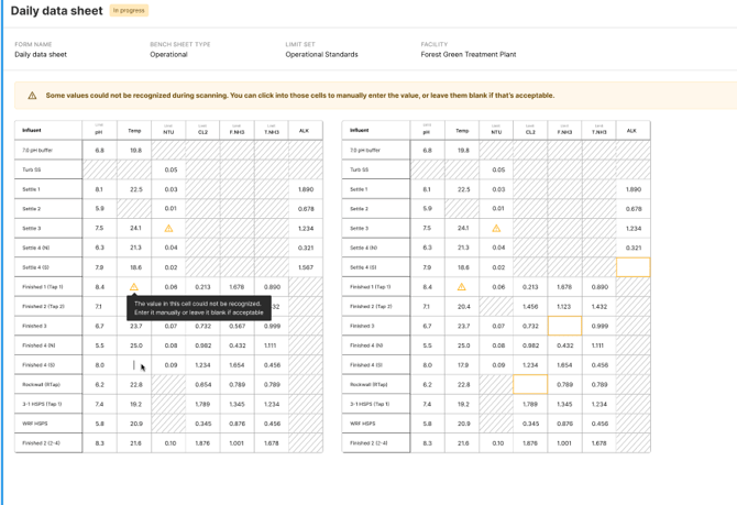 - Cells with low OCR confidence are marked with a yellow triangle.