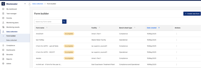 All forms appear in the Form Builder table with status indicators.
