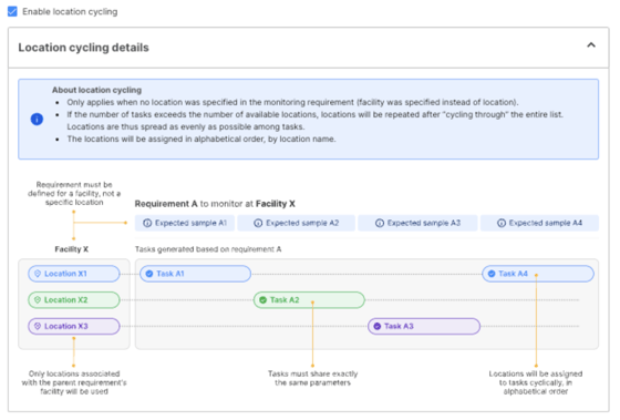 The introduction of the “Location” tab when using task auto generation enhances the distribution of sampling locations for requirements associated with facilities. When generating tasks for a facility-linked requirement, you can enable “location cycling,” a feature that assigns different locations to each task from the set associated with the facility. This distribution follows an alphabetical order, ensuring an even spread of tasks across locations. Once all locations have been assigned a task, the process repeats for the remaining tasks until all are accounted for within the facility. This feature streamlines the task assignment process, ensuring a systematic and efficient distribution of tasks across various locations.