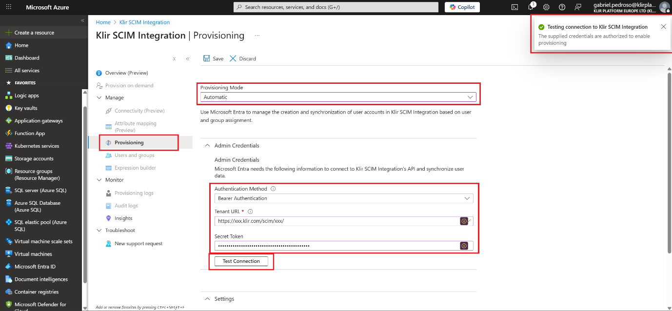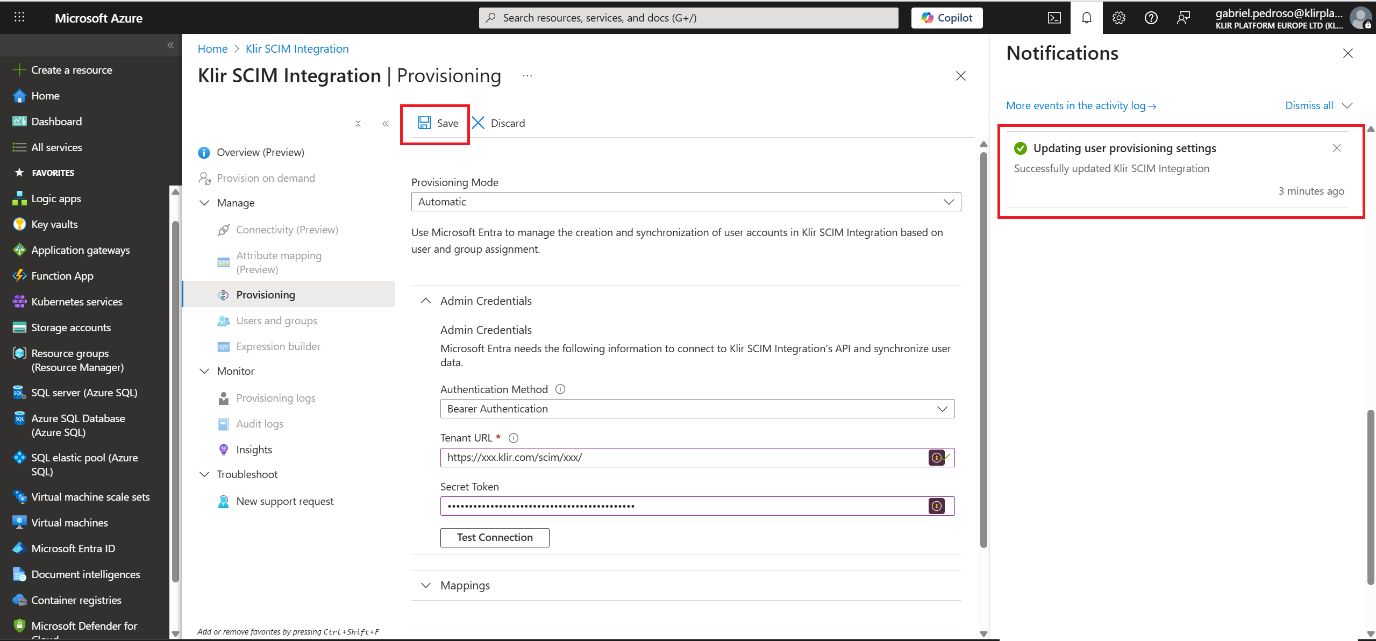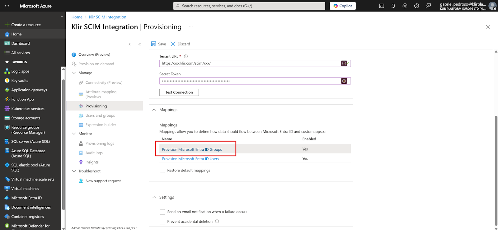Having the Azure Active Directory configured for the organization. Klir should provide the SCIM URL and the Token to authenticate the application.