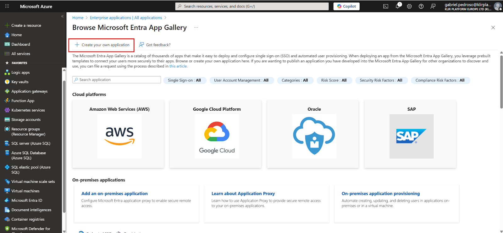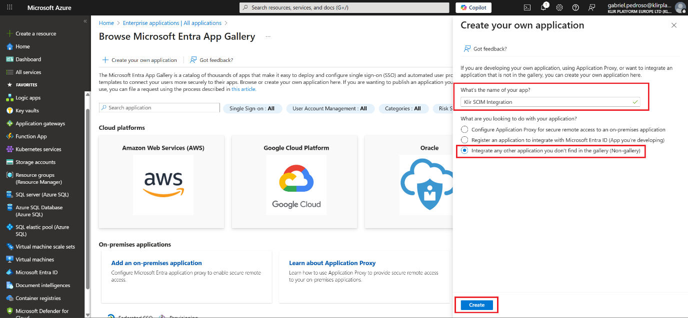 - Name it (e.g., Klir SCIM Integration) and select “Integrate any other application you don’t find in the gallery (Non-gallery)”